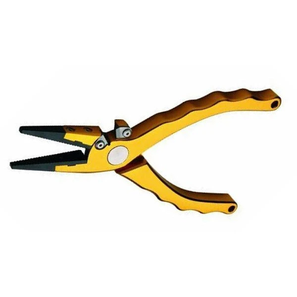 The P-Line Adaro Pliers feature machine cut aluminum handles for reduced weight.Β The tungsten carbide cutters are built specifically for braided line.Β The jaws are made of a coated stainless steel for strength and durability.Β This tool comes with a cordura pouch and a heavy duty nylon lanyard, making it the ultimate value for the serious angler.