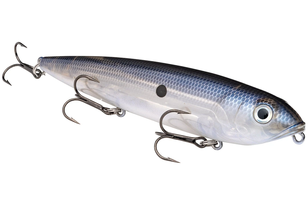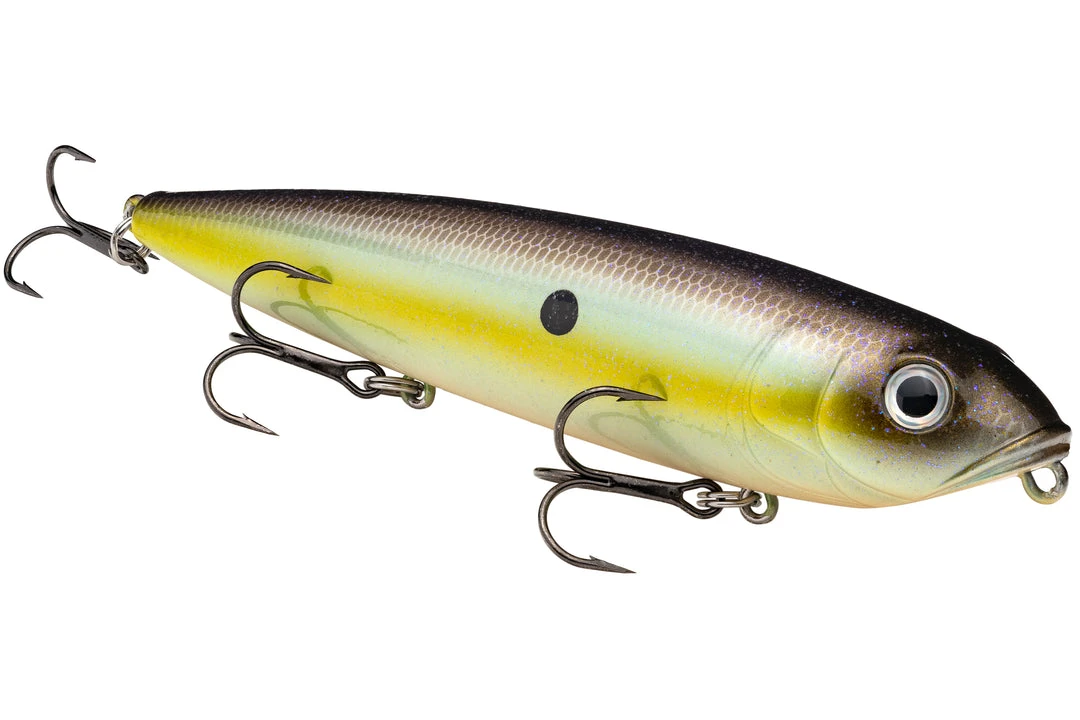 The Strike King KVD Mega Dawg Topwater Walker is a 6 inch, 2 ounce topwater walker made to be the premium oversized “walk-the-dog” (aka “Spook-style”) topwater lure. A supersized version of the top-selling Sexy Dawg, it retains its unique, streamlined body design that makes it come to life rhythmically with great side-to-side action walking action with a simple twitch of the rod tip. The large size makes it great for largemouth and stripers that are keyed in on larger forage. To upgrade its attention grabbing, it is fitted with a boisterous rattle chamber. Super-strong treble hooks make sure every strike is a catch. Available in 10 colors.