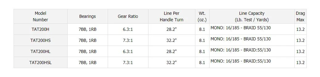 | TAT200H | 7BB, 1RB | 6.3:1 | 28.2″ | 8.1 | MONO: 16/185 – BRAID 55/130 | 13.2 |